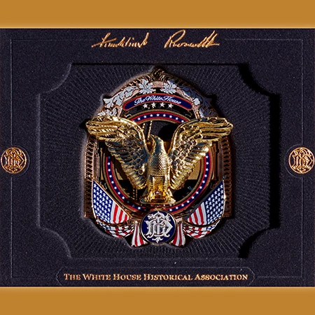 The ornament was designed using elements that transpired during President Roosevelt’s administration. The eagle cartouche was displayed on President Roosevelt’s first inauguration stand. Below the eagle is to flags with forty-eight stars representing the number of states in the union during Roosevelt’s four terms. The shape of the ornament is reminiscent of the silhouette of a tabletop radio similar to ones American families listened to President Roosevelt’s famous weekly Fireside Chats. Roosevelt’s beloved dog Fala is pictured on the back of the ornament, sitting next to a festive Christmas tree and presents. A white leaf motif accenting the ornament edges is based on exterior stone molding that adorning the White House north portico entrance. Four stars toward the top of the ornament represent Roosevelt’s historic four terms as president and the chevron border recalls the design of a card case he carried while serving in office.