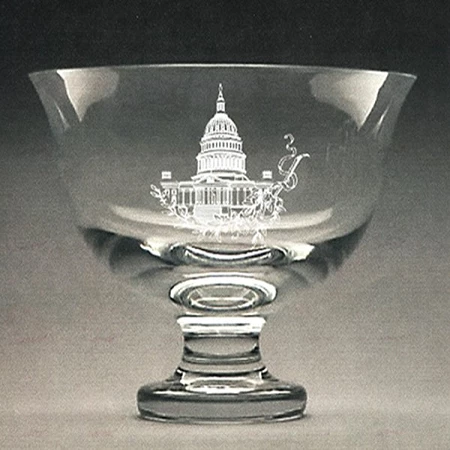 Capitol Presidential Bowl: Capitol Presidential Bowl has height of 5.75” and diameter of 7”. A deep engraved detail of the Capitol, done by hand. It creates prisms of light that cast their own shadows and rainbows of color.