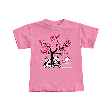 This Official Pink National Cherry Blossom Festival Tee Shirt features two pandas sitting under a Yoshino tree. Sizes XS, S,M,L